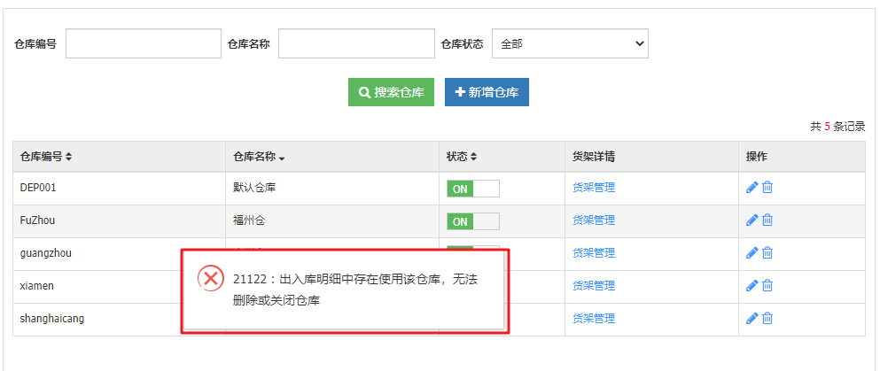 目前被商品使用的仓库,不允许删除或者关闭仓库;