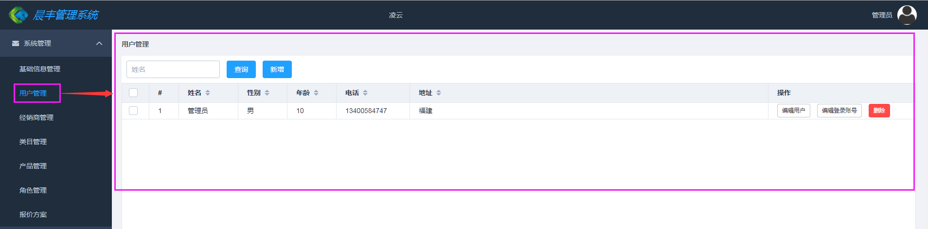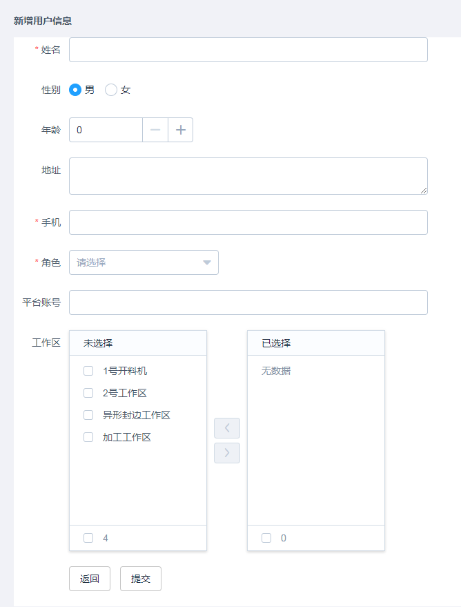 编辑姓名、性别、年龄、地址、手机、角色、平台账号、工作区,点击“提交”