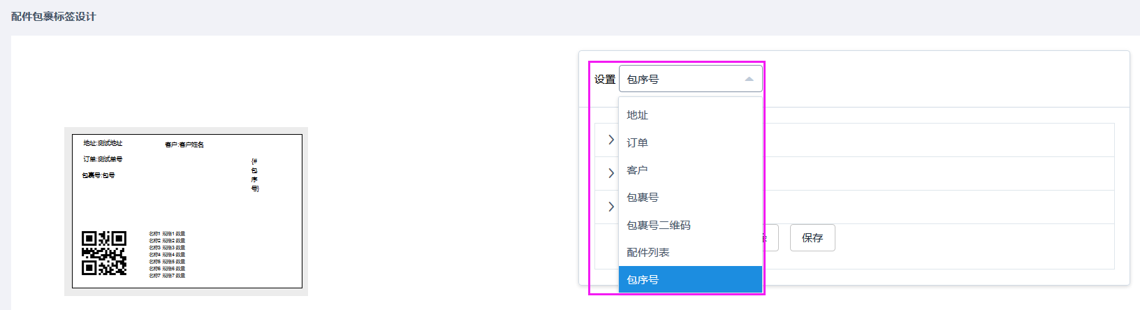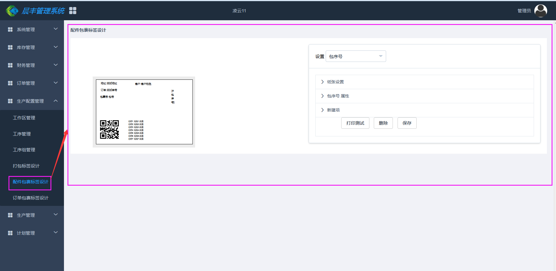 点击生产配置管理的配件包裹标签设计进入配件包裹标签设计页面