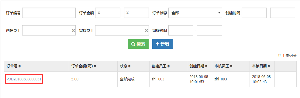 完善信息后,点击保存,订单新增成功,但状态为未完成