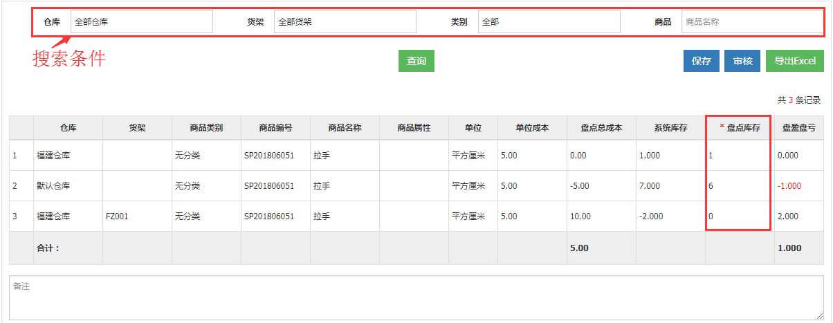用户根据搜索条件查询对应的盘点数据,然后根据在仓库盘点的数量输入到盘点库存;