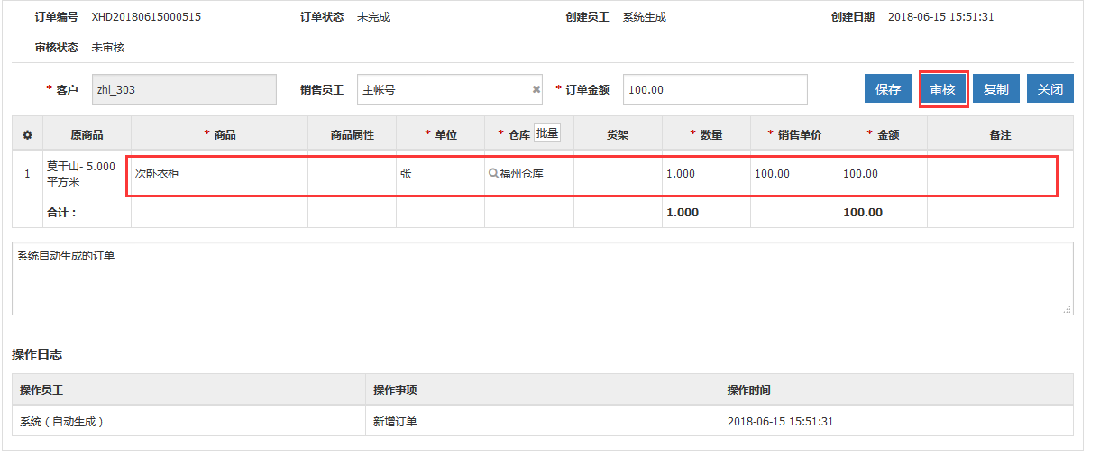 审核通过,会在ERP中心—订单管理界面,生产一笔销售订单;