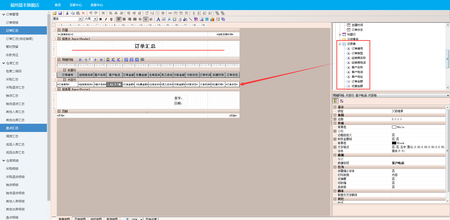 如图所示的就是报表中的重要部分:报表的内容行