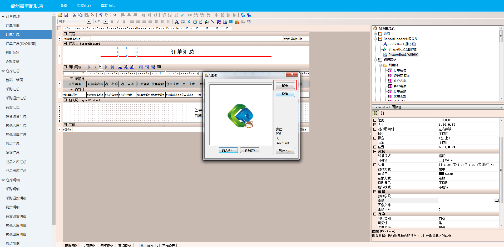 可在报表的表头中上传图片,点击报表设计中的图像框