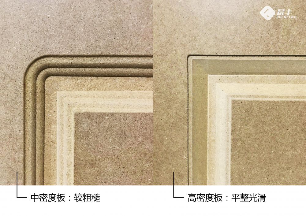 高密度板摸上去手感较为细腻,中密度板较为粗糙。在造型的体现上尤为突出,中密度板做完造型,造型表层会有毛边现象,高密度板较为平整光滑。