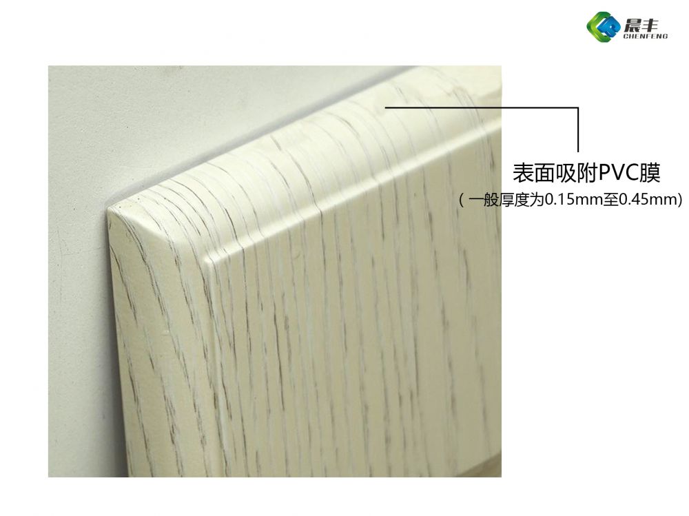 吸塑门板以其表面材质和工艺而得名,吸塑门板表面吸附PVC膜。PVC膜是一种高分子合成材料,广泛运用于电线、钢管、家具、五金等多个领域。吸塑门板选用的PVC膜一般厚度为0.15毫米至0.45毫米。