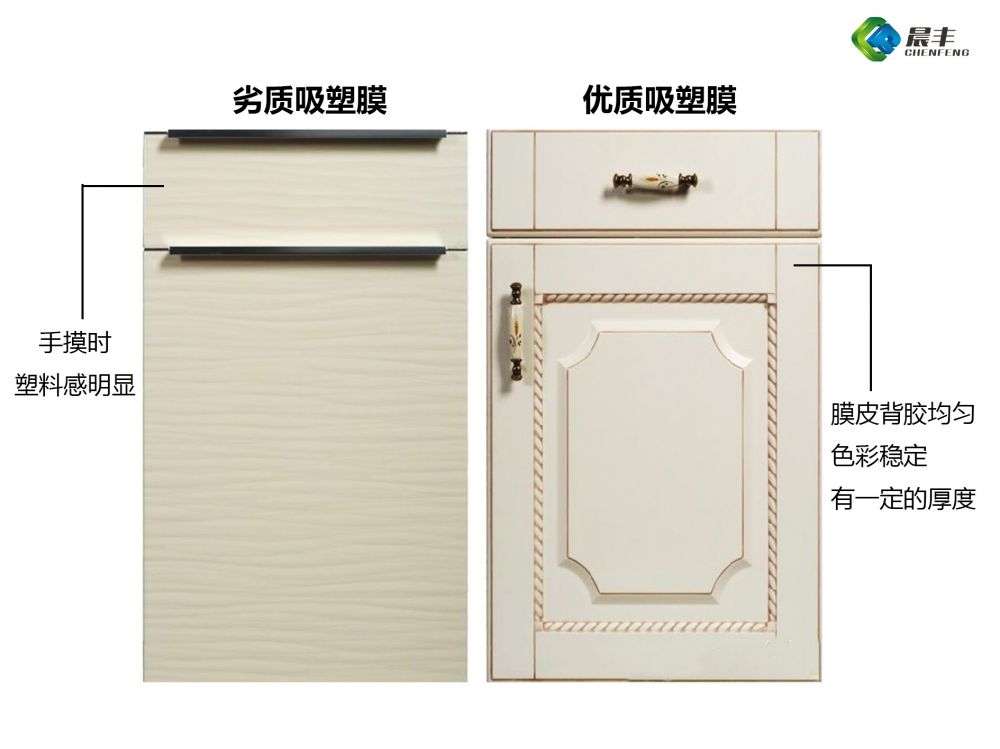 吸塑膜的质量好坏直接决定成品吸塑门板的档次与使用性能。好的吸塑膜要达到一定的厚度,膜皮背胶均匀,色彩要稳定。