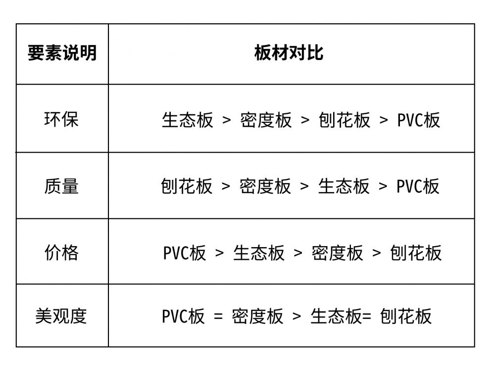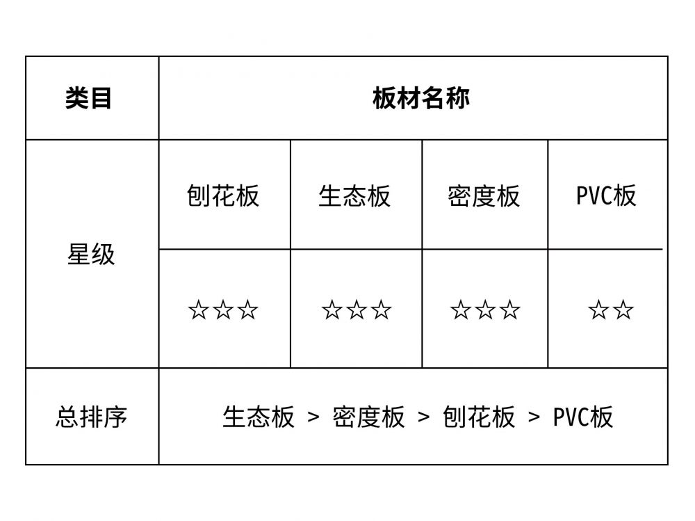 强度排行:生态板 > 刨花板 > 密度板 > PVC板