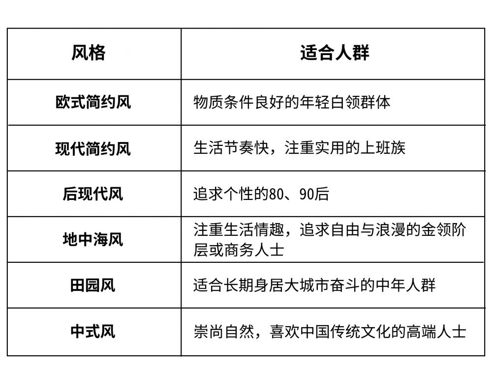 以生态板适合的欧式简约风、现代简约风、后现代风为主要,其它风格为次要进行总结,列表如下: