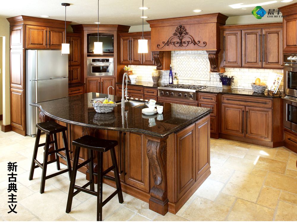 风格中多仿旧漆,式样厚重,橱柜门板一般以实木门或白色模压门为主,吸塑门板即为模压门板,与风格常用门板不谋而合。