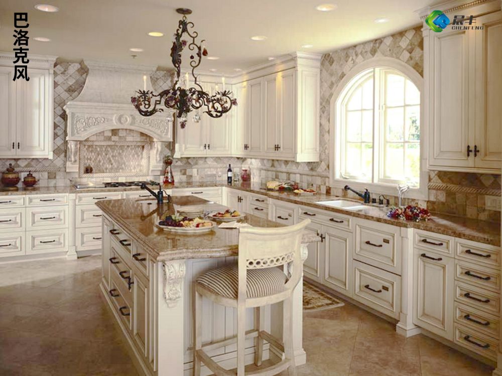 欧式橱柜风格里,软装饰起着重要的关键性作用,与硬装欧式细节相称,有着西化的图案、线条和造型,精细的曲线和图案。