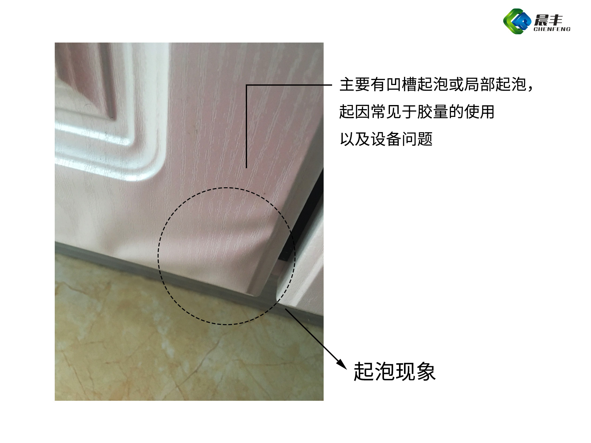 起泡现象主要有凹槽起泡或局部起泡,起因常见于胶量的使用以及设备问题,解决方式主要有:加工过程中,保证用胶量的足够;及时检修设备。