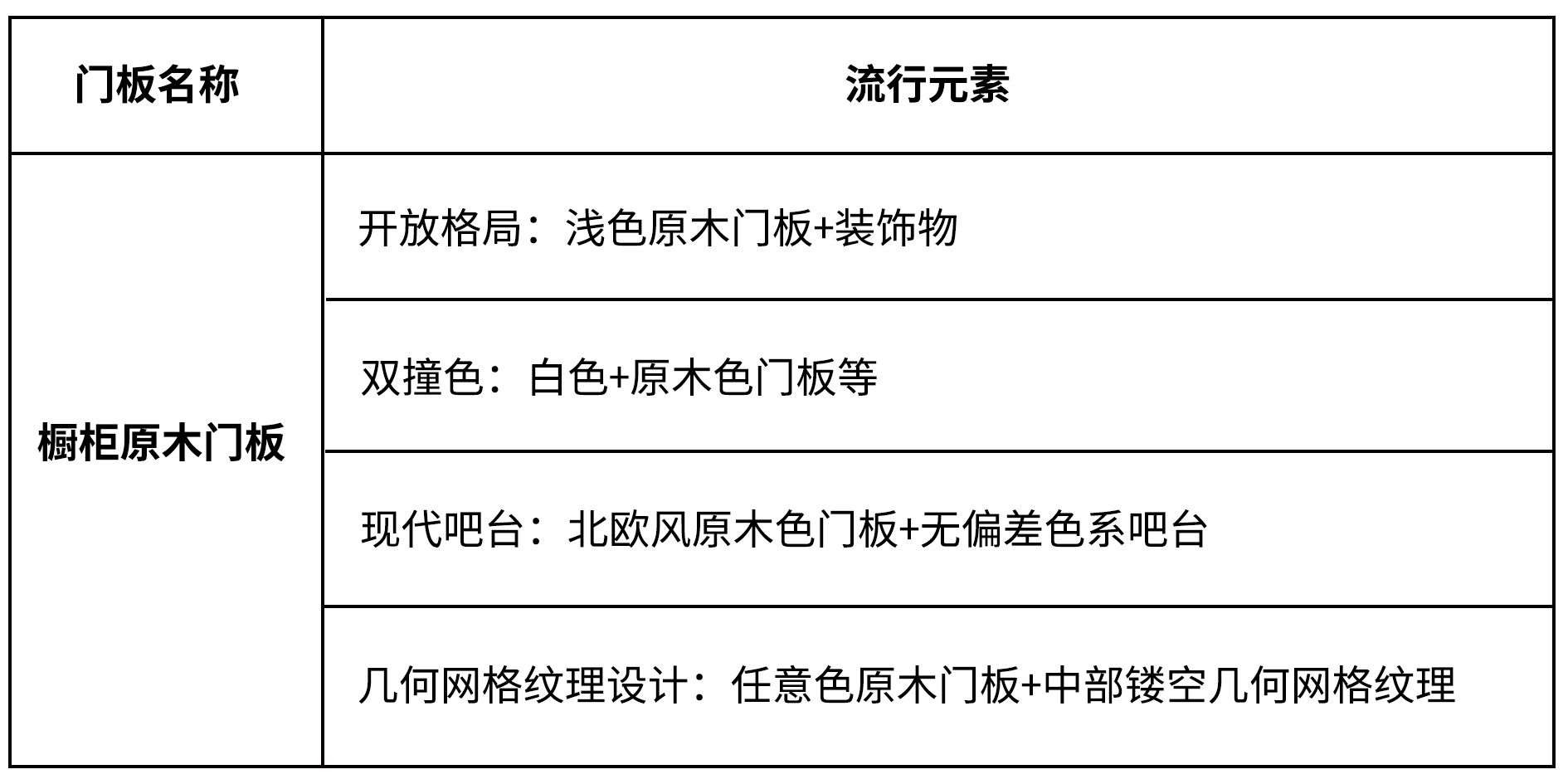 由上可见,橱柜原木门板正逐渐被融入现代流行元素,创造的新型装饰风格正随着时间被市场所接纳。接下来,我们对收集的信息做一个总结: