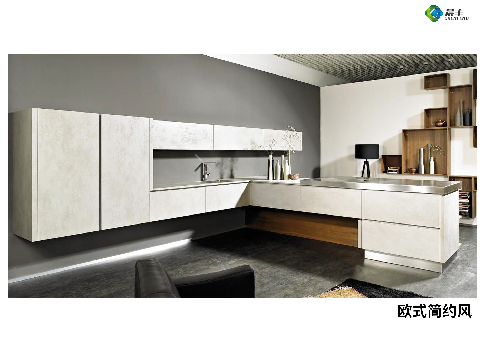 欧式简约风比较注重的是线条,橱柜双饰面板不可做锣花,但是线条结构可以通过人工进行处理,在色调搭配上也适宜。